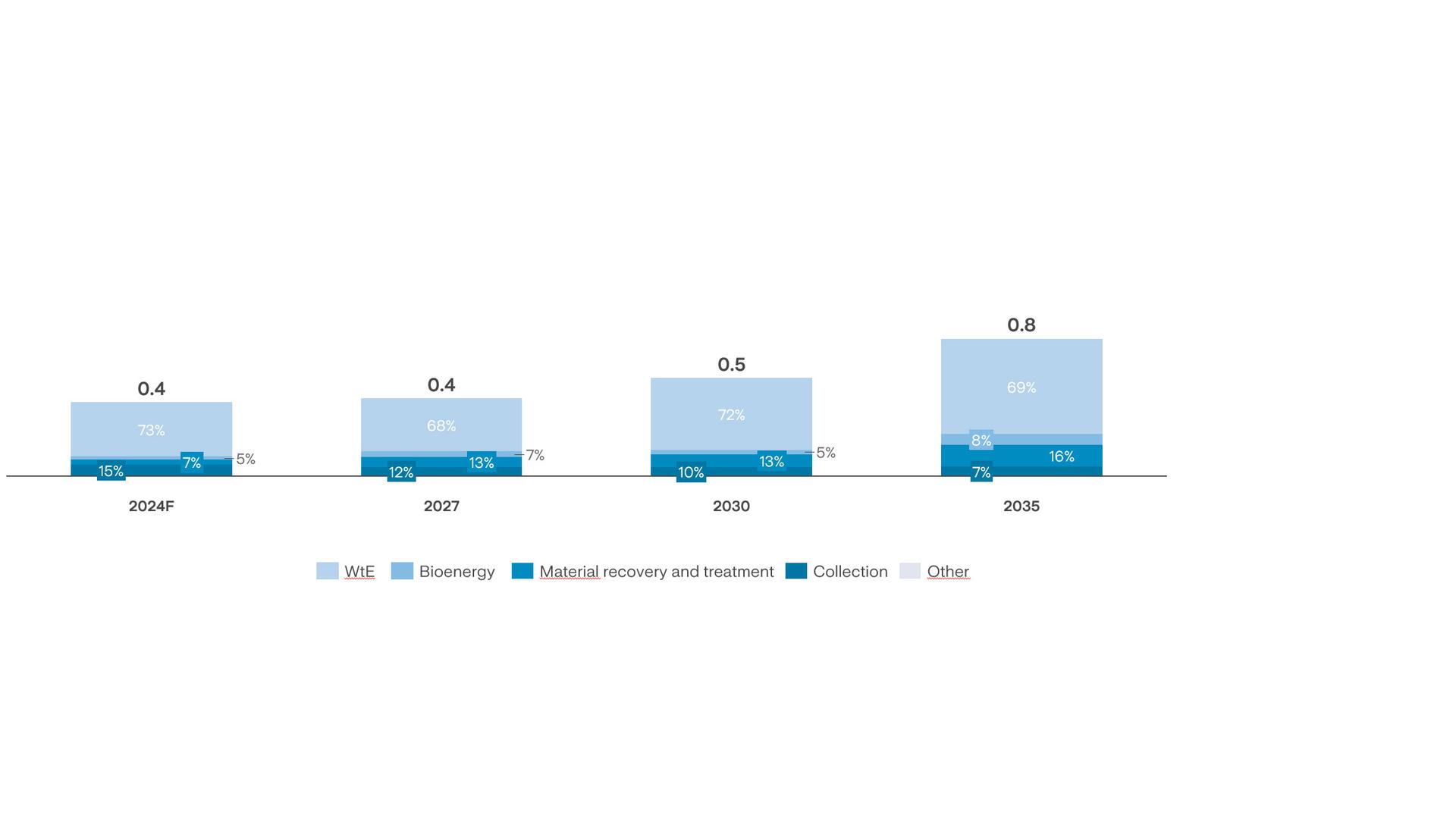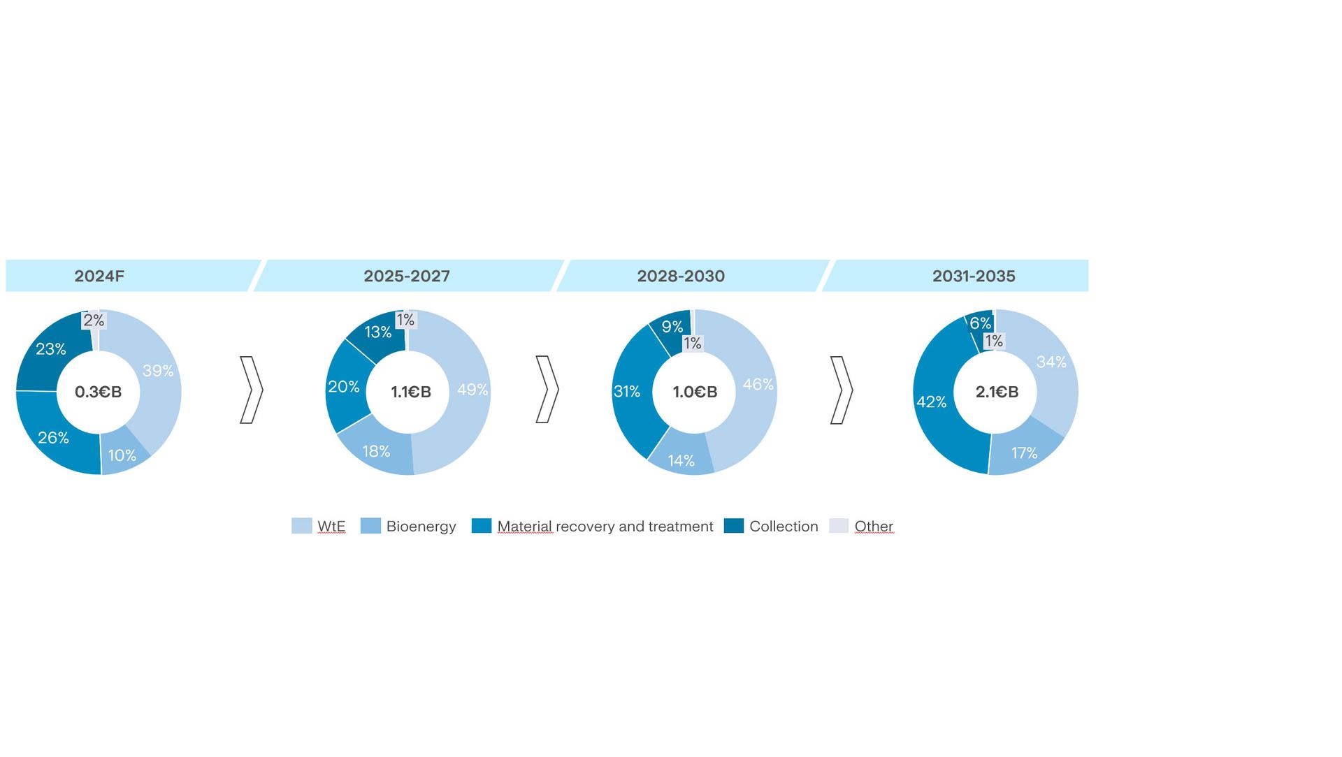 The investments are about 4.4 billion euros are related to the Environment Business Unit, of which 4 billion is related to the Treatment sector and 0.4 billion to the Collection business. Regarding Treatment, the total amount is divided into WTE for 1.8 billion, in Material Recovery and other treatment plants for 1.5 billion, and in Bioenergy and FORSU for 0.7 billion.