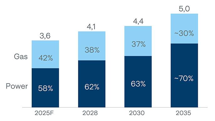Nell’ambito della transizione energetica prevediamo di raggiungere 4 miliardi di euro di RAB nelle reti elettriche, 3,7 GW di capacità eolica e fotovoltaica e 5 milioni di clienti al 2035.