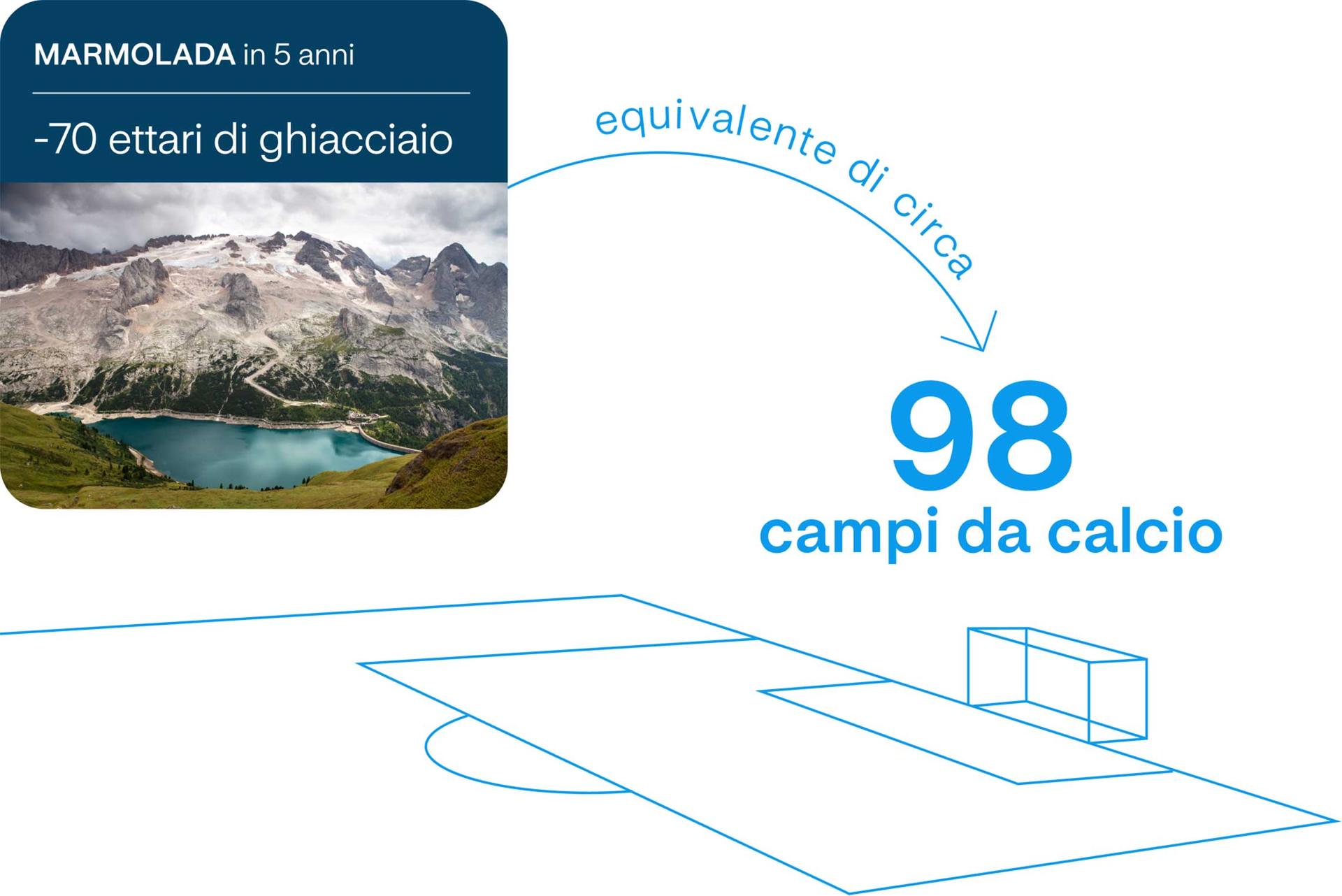 Secondo l’ultimo report di Legambiente (Carovana dei ghiacciai) entro il 2050 tutti i ghiacciai al di sotto dei 3500 metri scompariranno sotto gli effetti del riscaldamento globale. Nello specifico, sono sette i ghiacciai italiani a rischio, dislocati in tutte le regioni del nord: Valle d’Aosta, Piemonte, Lombardia, Veneto e Trentino-Alto Adige. Tra questi c’è anche quello della Marmolada, il più grande delle Dolomiti, che negli ultimi cinque anni ha perso ben 70 ettari, ossia l’equivalente di circa 98 campi da calcio.