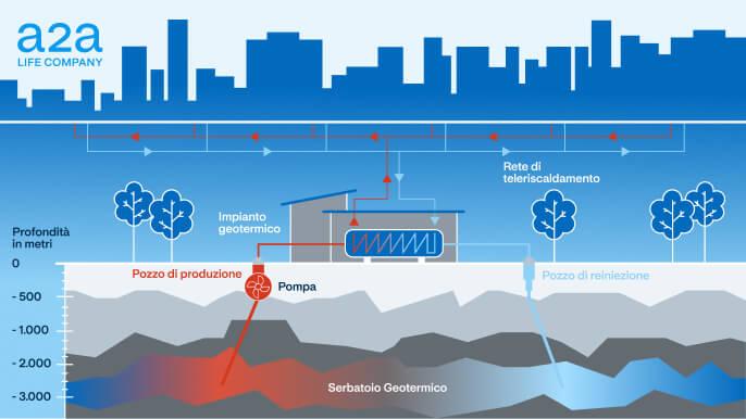 A2A Calore e Servizi, società del Gruppo A2A, in qualità di operatore della rete di teleriscaldamento, ha la possibilità di integrare la geotermia all’interno del sistema energetico locale, utilizzando il calore naturale del sottosuolo per fornire un servizio efficiente e affidabile per i cittadini. Attraverso la progettazione, la gestione e l’ottimizzazione degli impianti e della rete del teleriscaldamento ci si può avvalere delle risorse del territorio contribuendo in modo concreto alla riduzione delle emissioni e alla transizione verso un sistema di riscaldamento sempre più sostenibile.
