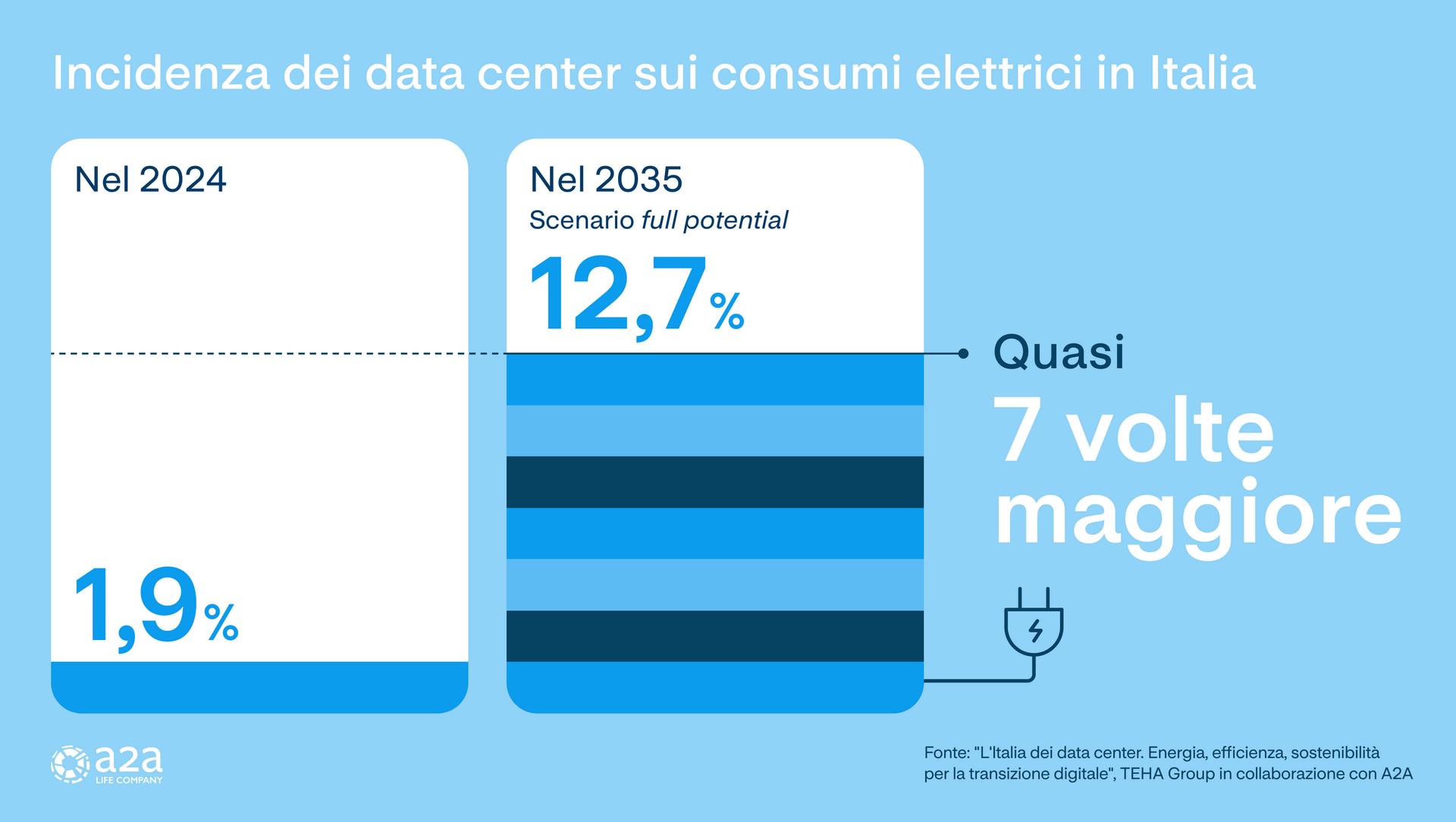 Solo nel 2024 sono stati censiti 10.332 data center a livello globale, di cui oltre 2.200 in Unione Europea e 168 in Italia, con Milano e la Lombardia che si posizionano tra le aree emergenti a livello europeo per la loro localizzazione. Entro il 2035, il consumo energetico dei data center è destinato a quadruplicare rispetto ai livelli del 2024, raggiungendo il 4% dei consumi elettrici globali. In Italia, invece, nello scenario di maggiore sviluppo, il fabbisogno elettrico potrebbe arrivare al 12,7% del totale nazionale (quasi sette volte maggiore rispetto all’1,9% nel 2024).