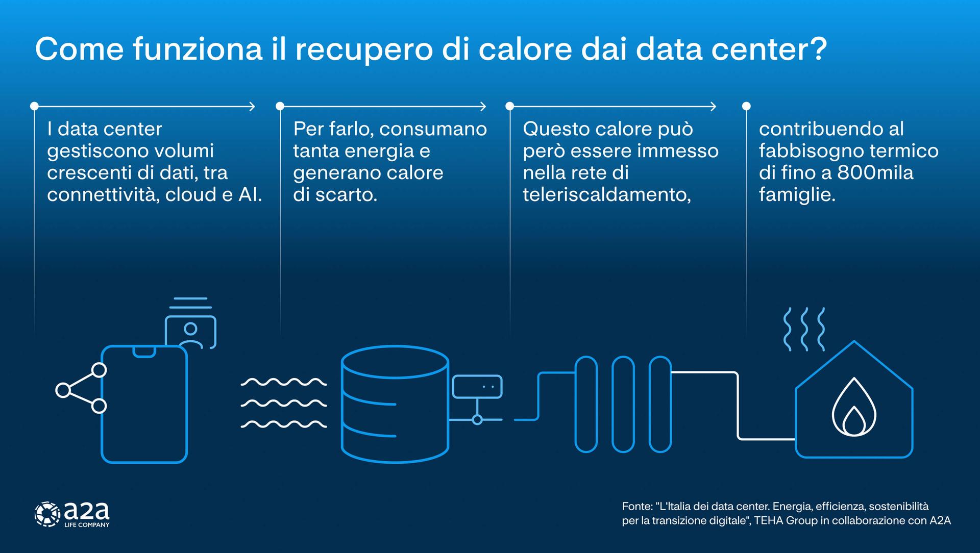 C’è poi un altro fattore da considerare: oggi, nelle città, non c’è niente che può generare più calore di scarto dei data center. Attraverso l’allacciamento alla rete di teleriscaldamento, il calore prodotto dai data center può essere recuperato, alimentando il riscaldamento nei centri urbani.