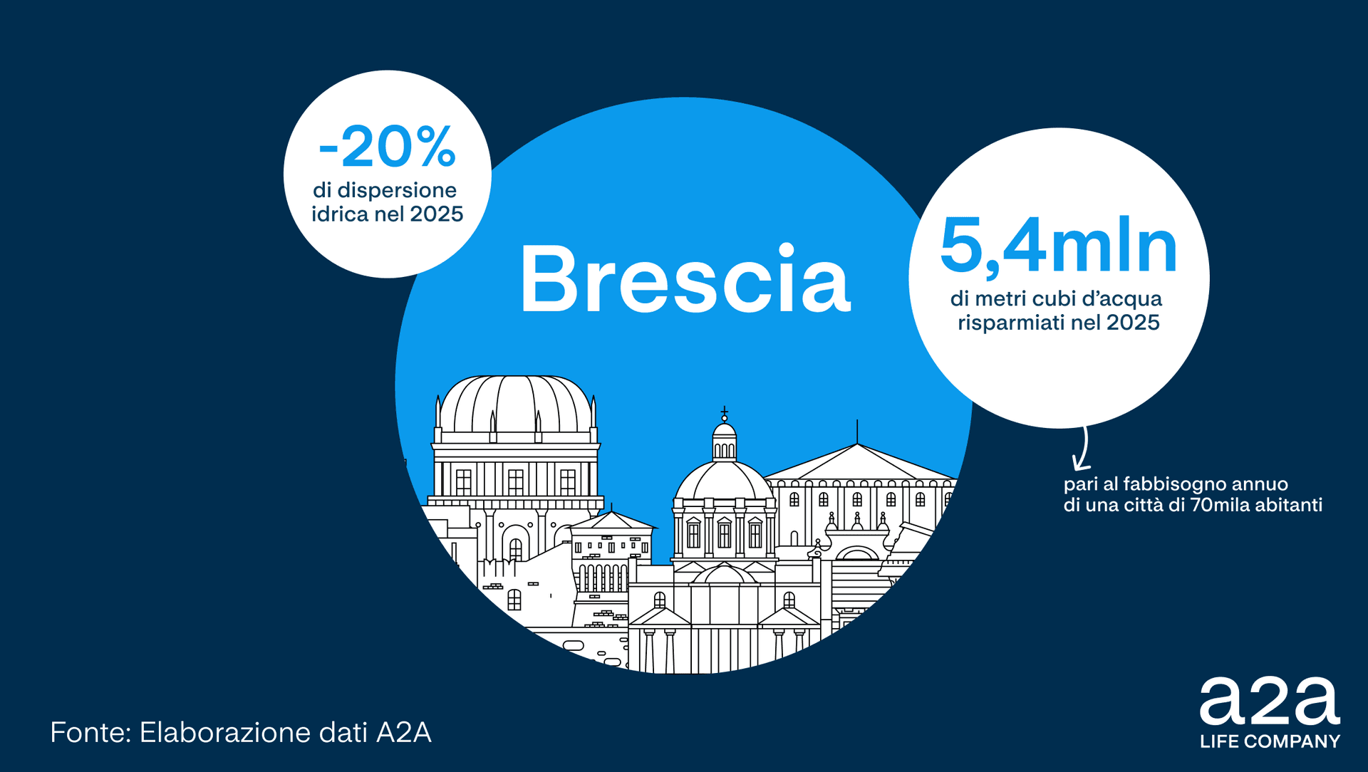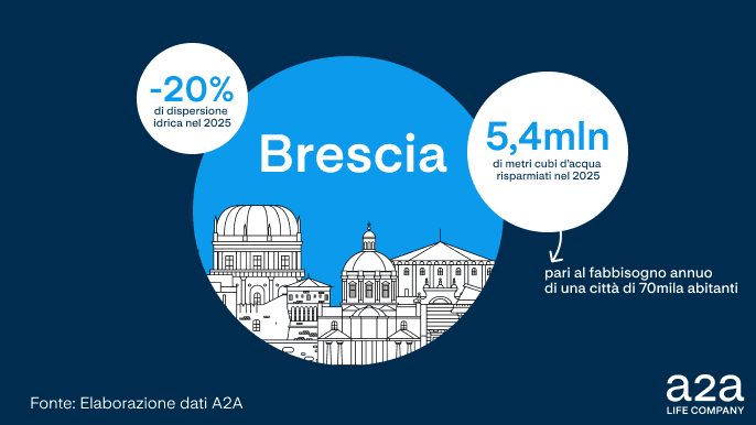 A questo si affianca la distrettualizzazione della rete idrica urbana, attraverso cui suddividiamo la città in aree più piccole, chiamate distretti, così da controllare con maggiore precisione pressioni e flussi e facilitare l’individuazione delle perdite. Grazie a monitoraggio continuo, distrettualizzazione e sensoristica avanzata, nel 2025 a Brescia la dispersione idrica della rete cittadina è scesa al 20%. Dal 2017, la città ha risparmiato 5,4 milioni di metri cubi d’acqua, un quantitativo pari al fabbisogno annuale di una città di 70.000 abitanti.