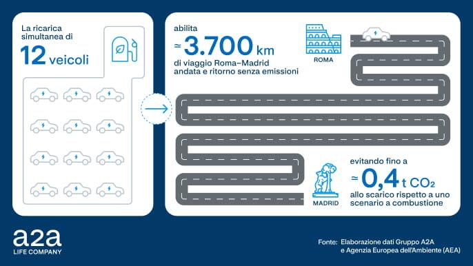 Immaginiamo una ricarica di riferimento da 50 kWh, che si traduce in oltre 300 km di autonomia, a seconda del veicolo e delle condizioni di utilizzo. Se 12 veicoli ricaricano simultaneamente il serbatoio di 50 kWh, ogni ora si ottengono circa 3.700 km complessivi percorsi in elettrico senza emissioni inquinanti allo scarico durante la guida. Una distanza di poco superiore a un viaggio in auto Roma- Madrid andata e ritorno, con maggiori benefici rispetto alla stessa distanza percorsa da auto a benzina.