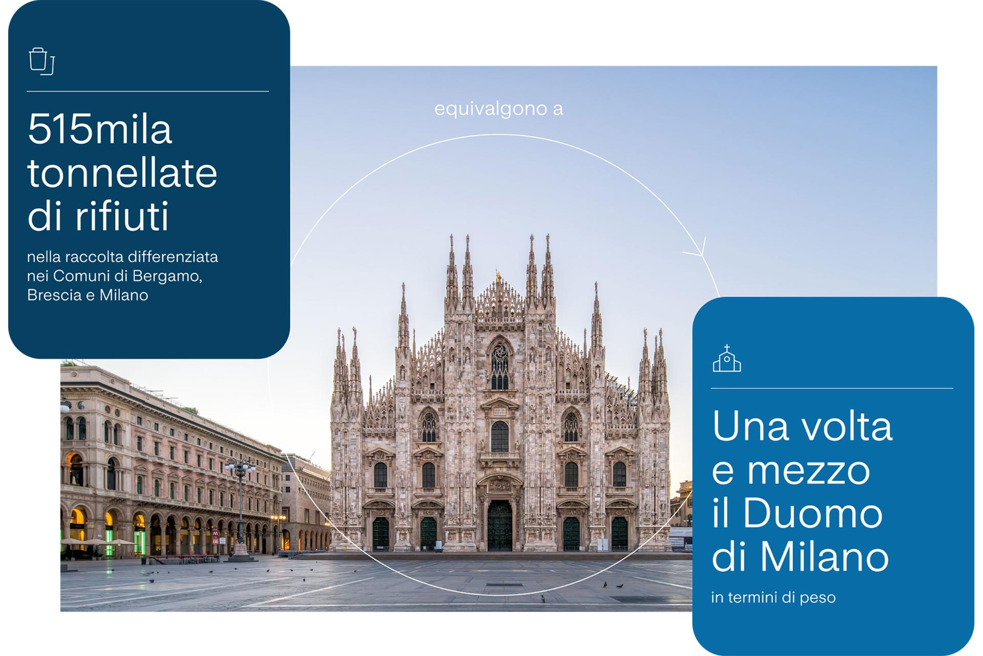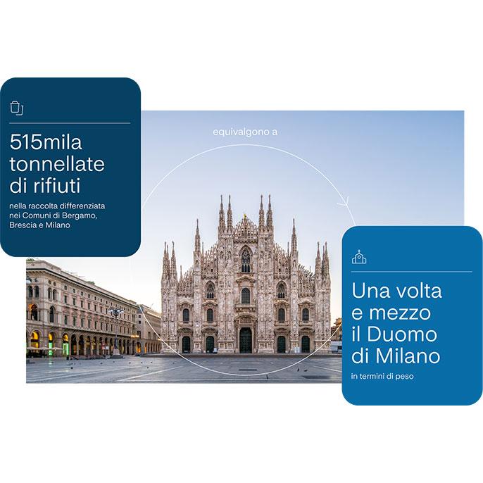 Immaginate per un attimo la piazza Vecchia di Bergamo come una grande distesa di vetro, con il Campanone, anch’esso trasparente, che la sorveglia; il Duomo di Milano fatto di plastica e il Capitolium di Brescia costruito interamente con carta e cartone. Un’idea un po’ folle, che però aiuta a comprendere l’ottimo lavoro che le tre città stanno mettendo in atto in tema di raccolta differenziata. Quest’ultima permette di generare nuovo valore dagli scarti, e costituisce un elemento chiave dell’economia circolare: un modello fondamentale per il futuro del nostro Pianeta, verso cui i cittadini stanno dimostrando grande impegno e risultati eccellenti.